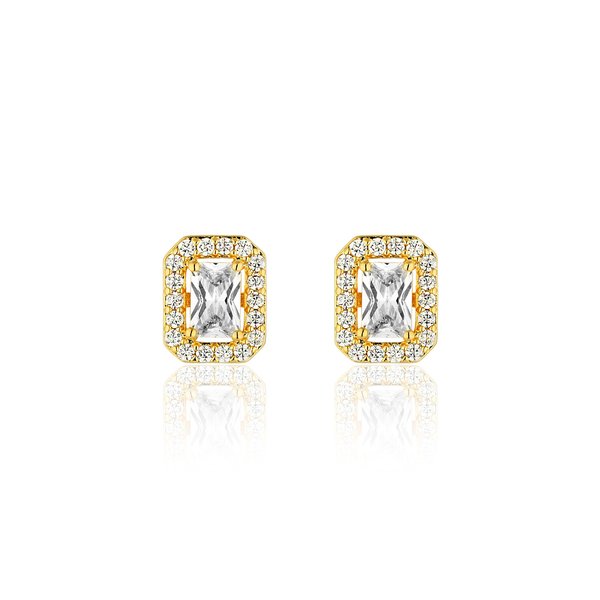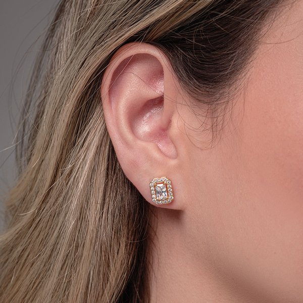 O design retangular com bordas levemente chanfradas valoriza o rosto e traz sofisticação imediata ao look. As zircônias cravejadas ao redor da pedra central garantem ainda mais brilho e charme à peça.