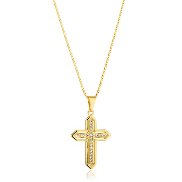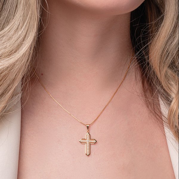 Com design robusto e linhas bem definidas, o pingente de cruz é cravejado por zircônias cintilantes que elevam a peça a outro nível. O banho em ouro garante um acabamento sofisticado e duradouro.