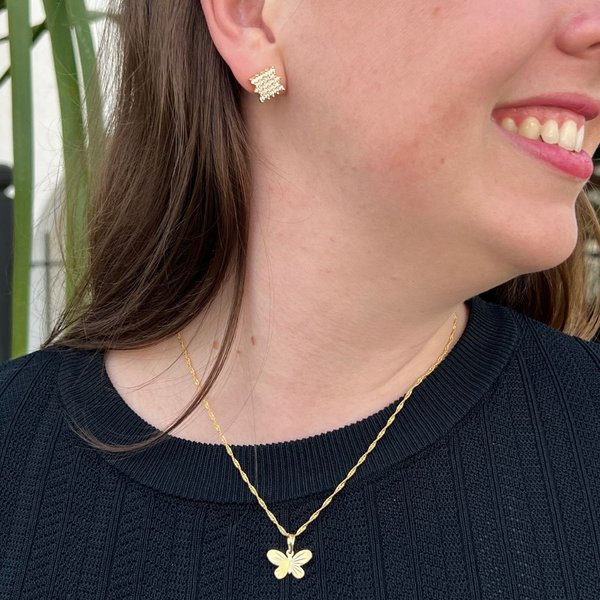 Conjunto Colar Com Pingente De Borboleta Diamantado E Brinco Quadrado Banhados a Ouro 18K