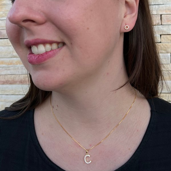 Delicado, personalizado e com brilho na medida certa. O Conjunto Letra & Luz – Banhados a Ouro 18K une um colar com a sua inicial cravejada de zircônias e um brinco vazado cheio de charme — perfeito para composições leves e cheias de significado.