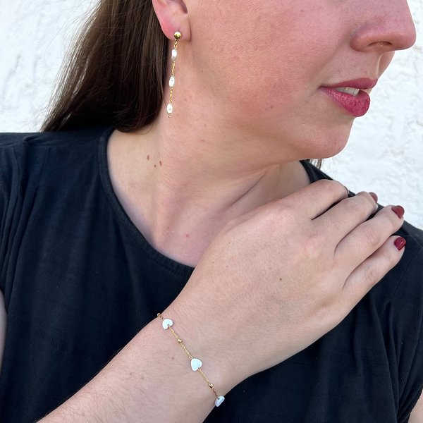 Conjunto Pulseira Corações Brancos E Brinco Longo Com Pérolas Banhados a Ouro 18K