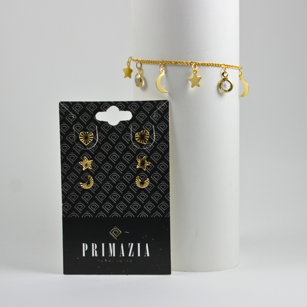 Mágico, simbólico e cheio de afeto. O Conjunto Universo Delicado – Banhados a Ouro 18K une o brilho das estrelas, o encanto da lua e o amor representado pelo coração. Um conjunto sutil que combina significado e beleza em cada detalhe.