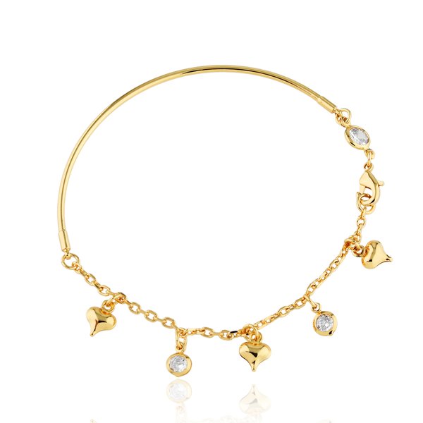 O design semirrígido proporciona um ajuste elegante no pulso, enquanto os pingentes em forma de coração e as zircônias cravadas trazem brilho e romantismo em cada detalhe. Uma peça leve, mas com presença.